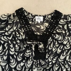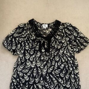 Black and white roses pattern Black woven Ribbon detail at neckline with tie knot Puffed sleeves Fully lined Pristine condition