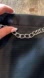 Sleek black pencil skirt with a silver chain accent. Features a vibrant green lining for a bold touch.