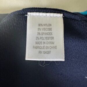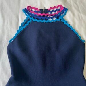 A-Line, navy blue, sleeveless, with light blue, royal blue and pink trim along the neckline, shoulder lines and around the bottom
