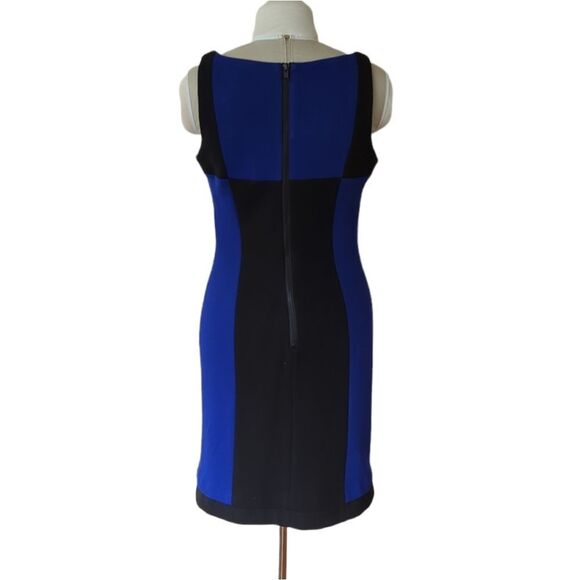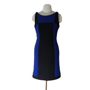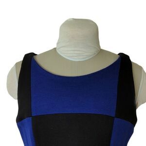 This is a sleeveless shift dress in a black and blue Colourblock pattern by Milly New York. Structured knit fabric that has a slight stretch.