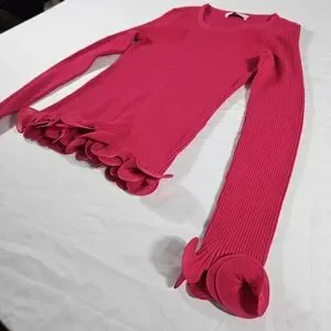 Chic pink blouse with ribbed texture. Features unique ruffle cuffs. Ideal for a stylish look.