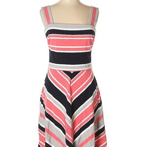Excellent used condition, Milly for Banana Republic A-line Striped dress. Size 4. Limited edition capsule collection by a renowned, new york designer. Flattering, thick, ponte knit fabric. Only ever been tried on. Some stitching is coming undone on the right seam, but nothing you couldn't very quickly fix with a couple of hand stitches or a sewing machine to reinforce the seam.