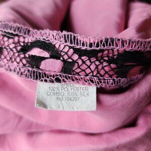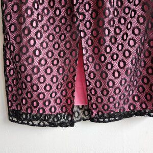 From designer brand Milly of New York, this gorgeous pencil skirt features a black openwork lace overlay over a pink silk slip. Black lace trim extends beyond the hem, while a back slit adds a chic, sexy touch. A skirt that works from office to cocktail.
