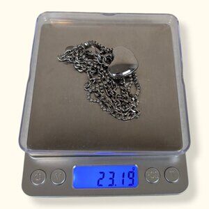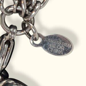 This bracelet by Milor is made of stainless steel and has a lobster clasp closure and a maker's tag stamped "STAINLESS STEEL MILOR CHINA". The bracelet has 4 different chain types as well as a puffy heart pendant. The bracelet has normal wear, including superficial marks in the metal, but no issues affecting wearability.