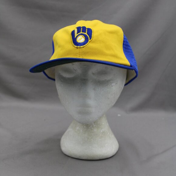 Up for sale is a vintage Milwaukee Brewers trucker hat. It has a blue body and brim with a yellow front. The front of the hat has the 1980s Brewers glove logo crested on. What a great vintage hat do not mss out on it.