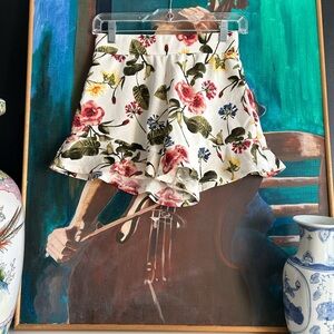 These high-waisted shorts from Mine feature a vibrant pink and green floral pattern, perfect for adding a pop of color to your summer wardrobe. The light and airy fabric ensures comfort in warm weather, while the mid-thigh length offers a flattering fit. Ideal for casual outings or a day at the beach, these shorts are a stylish choice for any occasion. Waist 25" rise 12"