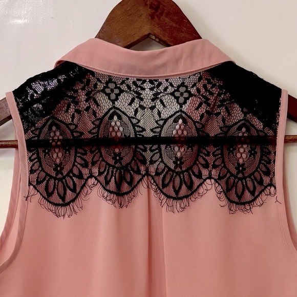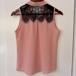Mine brand pretty pink blouse with intricate black lace on the back. Sleeveless fit, size small. In good pre-owned condition, laundered and ready to wear.