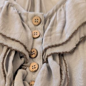 Chic blouse with ruffled neckline. Button accents add charm. Soft gray hue for versatile styling.