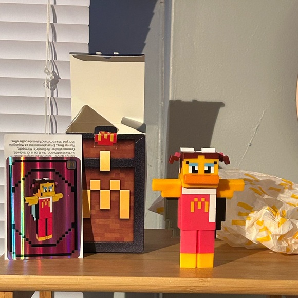 McDonalds Minecraft action figure with a matching card. Barely touched never mind used, though the box is a little crushed. All the stuff in the box that should be in there, though idk what any of it is 🤷♀️