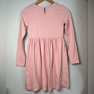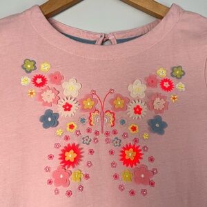 Mini Boden dress. Flutter Jersey dress. Featuring a mixture of floral appliqués and embroidery that create a butterfly. Really stunning. Light pink colour, long sleeves, pockets.