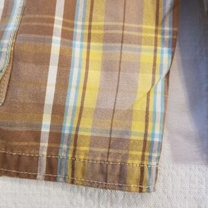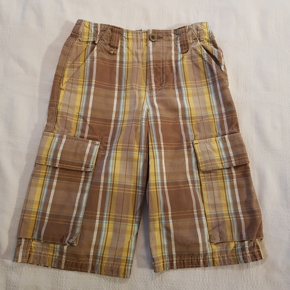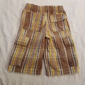 Mini Boden boys 5-6 years plaid shorts, they have adjustable waist, 2 front & 2 back buttoned pockets, side cargo buttoned pockets