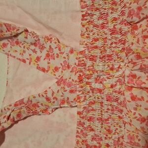 Mini Boden girls size 3-4 years, Floral print, white with pink, yellow redish orange flowers, adjustable ruffled straps, lined, back is smocked with tie, EUC