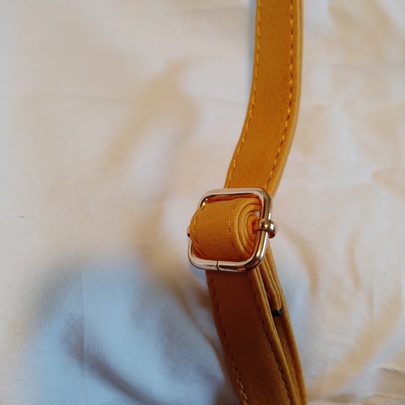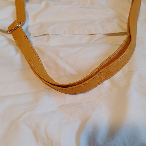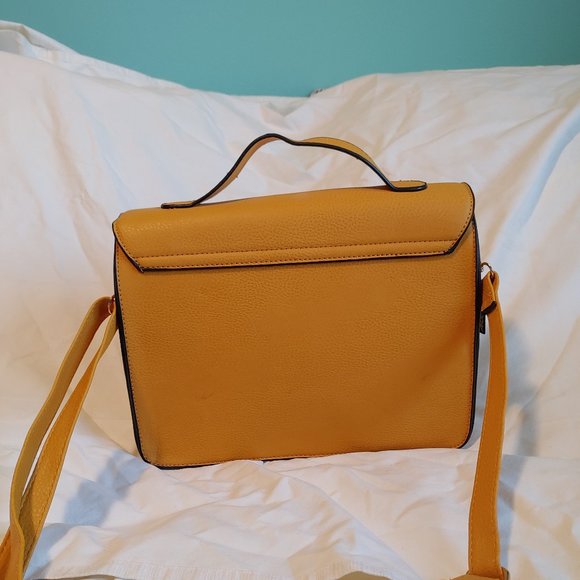 A beautiful small faux leather bookbag purse, rich yellow in color, with a strap on top, a large pocket in front, faux buckles with magnets to close, an inside zippered pouch and an removable crossbody strap.