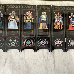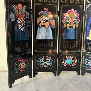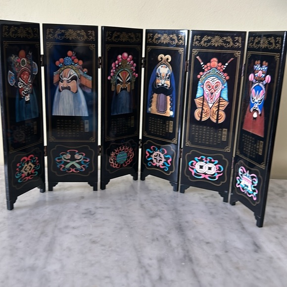 Mini 6 panel folding Chinese lacquerware desktop screen. Approx 9 1/2 in h x 16 in w. . Each individual panel is approx 9 in h x 3 in w. In very good condition.