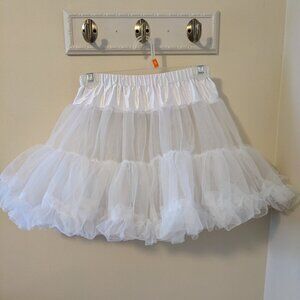 Super full and flirty mini crinoline in white. 2 layers of netting with bottom ruffles. Attached to satiny knit smooth waist area. Pull-down. Elasticized waist fits from 24" to 36". 14" long. New, never worn. White. Perfect for a French maid costume or other mini skirted outfit. Fits hip measurement up to 39".