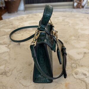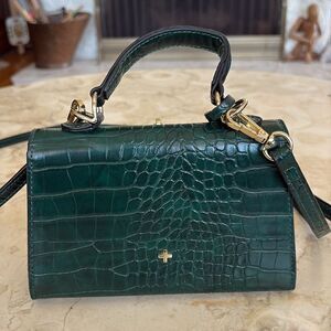 Cute and in excellent preowned condition, croc embossed green vegan leather mini bag. Kelly style, with lock and key, magnetic snap closure, detachable adjustable crossbody strap. Interior is clean, has a credit card sized slip pocket and roomy enough for a smaller cell phone and keys.