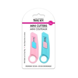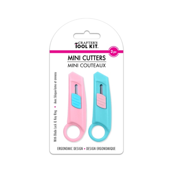 An essential for all crafters! With blade lock and key ring. Retractable cutters. The pack includes 2 mini cutters (as picture). Size: 1" x 3" inches.