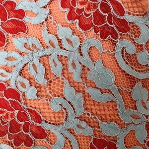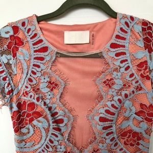 Multi colored mini dress - lace. Worn once to a friend’s wedding. Low cut from with sheer detail. Cap sleeves. Colours are peach, red and light blue. Zip closure at side.
