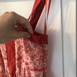 Very feminine, flowy, mini dress. It’s elastic at the top for an empire waist but has a side zipper so it gives you a nice shape. A Ruffled hem at the bottom. The color is burnt orange, not neon orange and the white gives the illusion of lace. The color is perfect for fall. Despite the light, flowy look of the dress it is not stretchy.