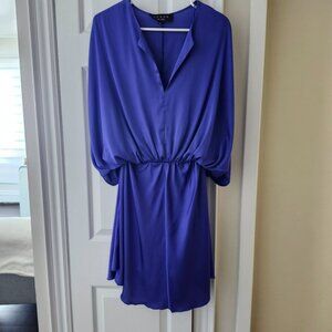 Elegant and chic royal blue mini dress by Lynne Black. This dress features a deep V-neckline, loose batwing sleeves, and a comfortable elastic waistband that creates a flattering silhouette. The back is accented with a signature Lynne gold-tone medallion detail, adding a touch of luxury.