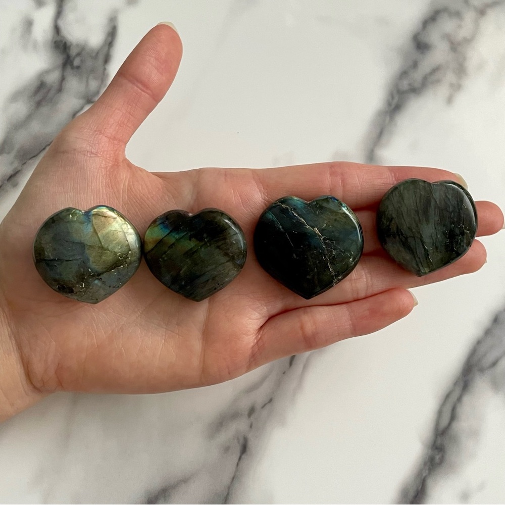 *Note each labradorite heart is unique and may vary in colouration/flash with natural imperfections such as cracks/fracturing and chips - see photos.
