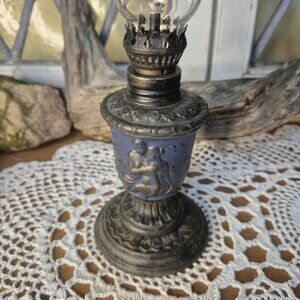 This beautiful set of 2 oil lamps made in Québec, CA, in 2000 is signed AB Cauchon. The bodies of these two attractive storm lamps appear to be made of resin, and their chimneys are translucent glass. They are intended for decorative purposes only.