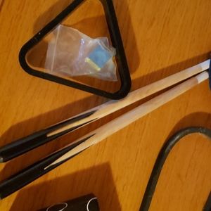 Laminated wood pool table with billiard balls, pool cues, plastic rack and pool charm included. Used occasionally but maintained in perfect condition.