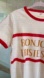 Cream tee with bold red trim and gold lettering. Features 'Bonjour Tristesse!' print. Fun and stylish.