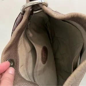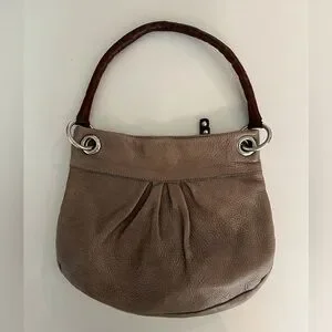 Mini roots leather hand bag. Pebble leather in a taupe body and brown leather handle. Also come with long cross-body strap. Shiny silver hardware. Size approx. 11” w x 9” h x 1.5” d.