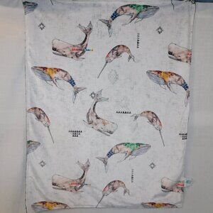 This beautiful MiniTipi Native Whale Theme Print Gray Micro Brushed Fleece Baby Blanket is in great clean bright soft condition. Blanket is 100% polyester - brushed micro fleece - Machine washable. Measures 26" x 34" . One side has white with whale graphics including narwhale, humpback and blue whales. Other side is solid gray with raised soft nubbies.