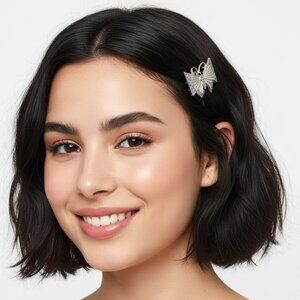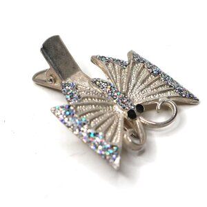 This is a charming, gently used mini butterfly alligator clip, a must-have accessory straight out of the Y2K and 90s revival trend! It features a classic butterfly shape in a shiny silver-tone metal and is accented with sparkling glitter for a delicate shimmer.