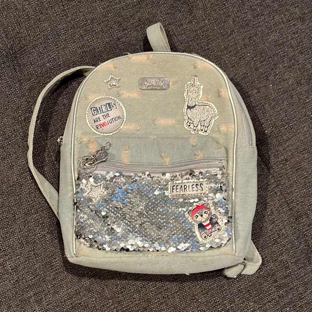 Denim mini backpack. Has patches on front and sequins on front pocket. Pictures show condition