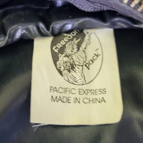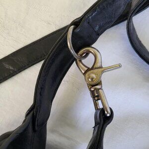 Metal clasp and ring, zippered opening. Pocket on back, zippered pocket in the front, adjustable strap,