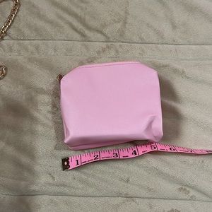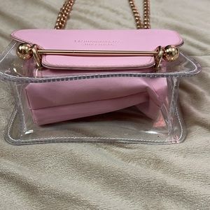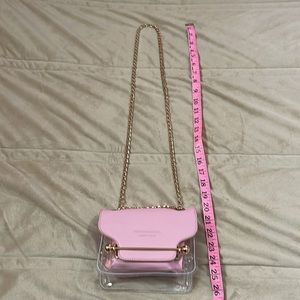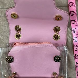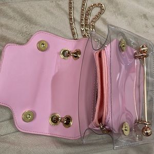 Mini clear purse with adjustable gold coloured chain. And removable inner pink matching zippered pocket. Excellent used condition.
