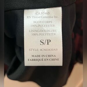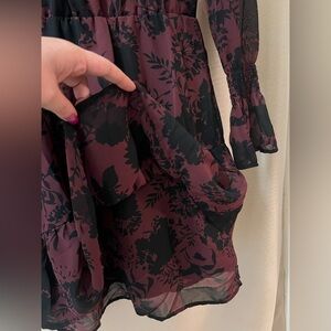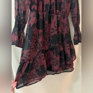 Long sleeve mini dress. Burgundy and black floral print. Elastic cuffs and waist. Tiered ruffle hem for a fun flirty fit.