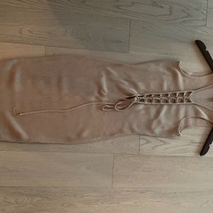 Beige cotton ribbed mini dress with tie up down the front. Very comfortable too.