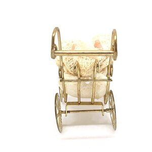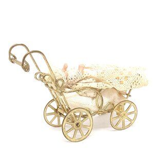 Miniature Baby Carriage Pram Stroller Brass Wire Metal & Lace-with Doll Antique
