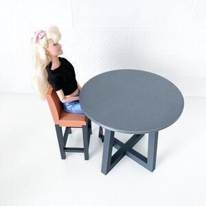 The table and chair set are 1:6 scale "counter height" for Barbie, Integrity or other 12" fashion dolls.