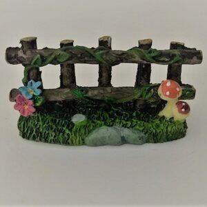 These Miniature Fences are made of polyresin and comes complete with simulated mushrooms, grass, stone, flowers as can be seen in the picture. Each measures approximately 3 inches in width, by 1 1/2 inches in height, and 1 1/8 inches in depth.