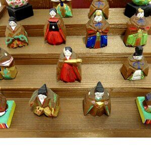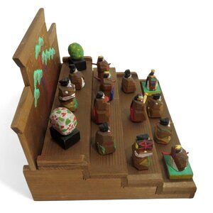 Miniature JAPANESE WOODEN Doll Set with Display Stand Handcrafted Vintage