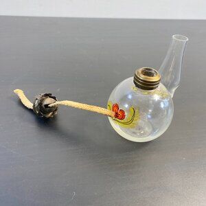 Miniature Oil Lamp Glass Hand Painted red White Flowers, Clear Top, Mini Rare Lamp, Clear Glass, Folk Art Design, Primitive Lighting.