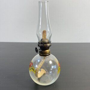Miniature Oil Lamp Glass Hand Painted red White Flowers, Clear Top, Mini Lamp.