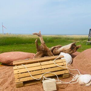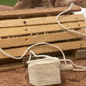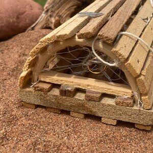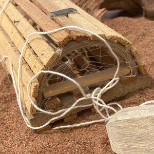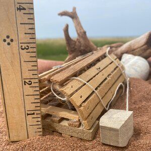 Here's some great nautical decor for your home. This would make a lovely gift for the nautical/history enthusiast in your life! It's a wooden replica of an east coast domed lobster trap. It measures about 5 by 3 inches and stands about 2 inches high. It's a very nice model with netting, a weight and 2 compartments and a working top door