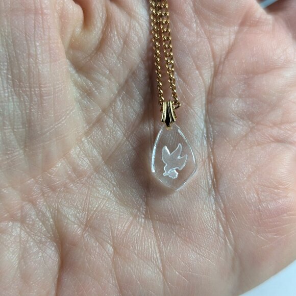 A Holy dove charm pendant, the laurel in his beak, intaglio reverse carved into glass or crystal. A lovely little pendant on a gold toned chain. The chain length is 45 cm, the pendant height including the bail is 2 cm