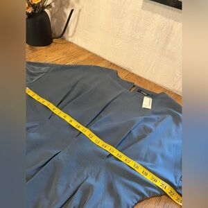 Modern and sleek, this minimalist dress by Icône (Simons) is crafted in a smooth slate blue polyester fabric with a slight sheen. Features include dolman sleeves, structured pleats at the waist for shape, and a hidden back zipper with button closure. Fully lined. New with tags (NWT). Size L/G. Made of 100% polyester.