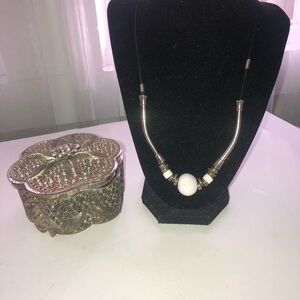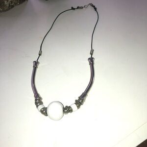 This minimalist necklace showcases a bold metal chain adorned with two large white beads that serve as the focal points. A contrasting dark central bead adds visual interest, making it a perfect accessory for any occasion. Its classic design ensures it can be worn effortlessly with a variety of outfits. Preowned please check pics over.