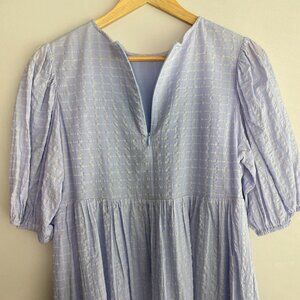 Elegant light blue midi dress by Minimum. Features puff sleeves and textured fabric. Perfect for any occasion.