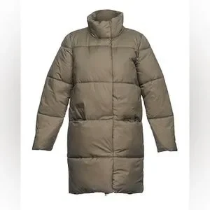Good condition puffer coat. No hood. Minimalist. A couple small snags near one of the pockets but not very noticeable.