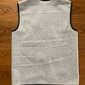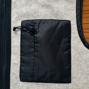 Lightweight vest coated with a blend of wool and polyester on the outer shell and polyester lining on the inside. The vest has a regular fit and features a chest pocket made from a contrasting material and zipper closure on the front.