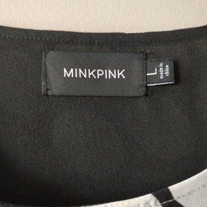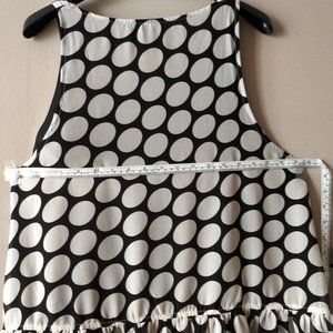 Mink Pink Navy + Polka Dot vest - fully lined. size Large but really is was sized in error. this top is more of a Medium. Either way it looks great with jeans or tights because it can be worn on top of a t-shirt, top, turtle neck or shirt... or by itself. Photos show enough detail. The colours posted show black and white because the navy is very dark. almost black. The bottom skirt makes this top flirty and flowy. It is meant to be wide and comfy. 100% polyester.